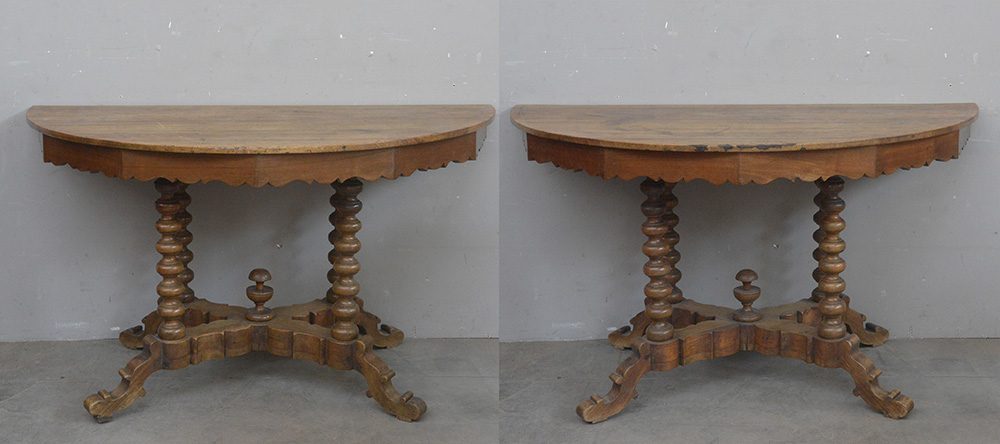 Coppia di tavoli a mezza luna con piano filettato, sostegni torniti riuniti da crociera a sagoma come i quattro piedi (cm 149x81x74)