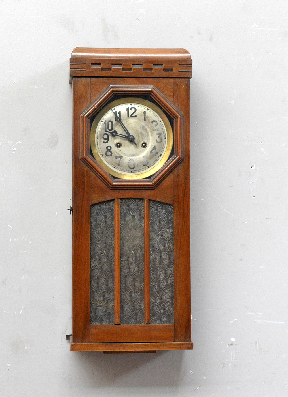 Pendola da parete con cassa in legno dolce, quadrante in metallo smaltato con numeri arabi, movimento con carica settimanale, suoneria dell ore e delle mezze su gong, anni '30/'40 del secolo XX (cm 27x66x13) (difetti)