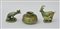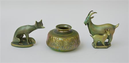 Lotto composto da un piccolo vaso decorato a rilievo e smaltato in verde a lustro metallico unito a due sculture raffiguranti animali con analoga lavorazione. Produzione Zsonlay, Ungheria, anni '30. (lievi difetti) -EN Lotto composto da un piccolo vaso decorato a rilievo e smaltato in verde a lustro metallico unito a due sculture raffiguranti animali con analoga lavorazione. Produzione Zsonlay, Ungheria, anni '30. (lievi difetti)