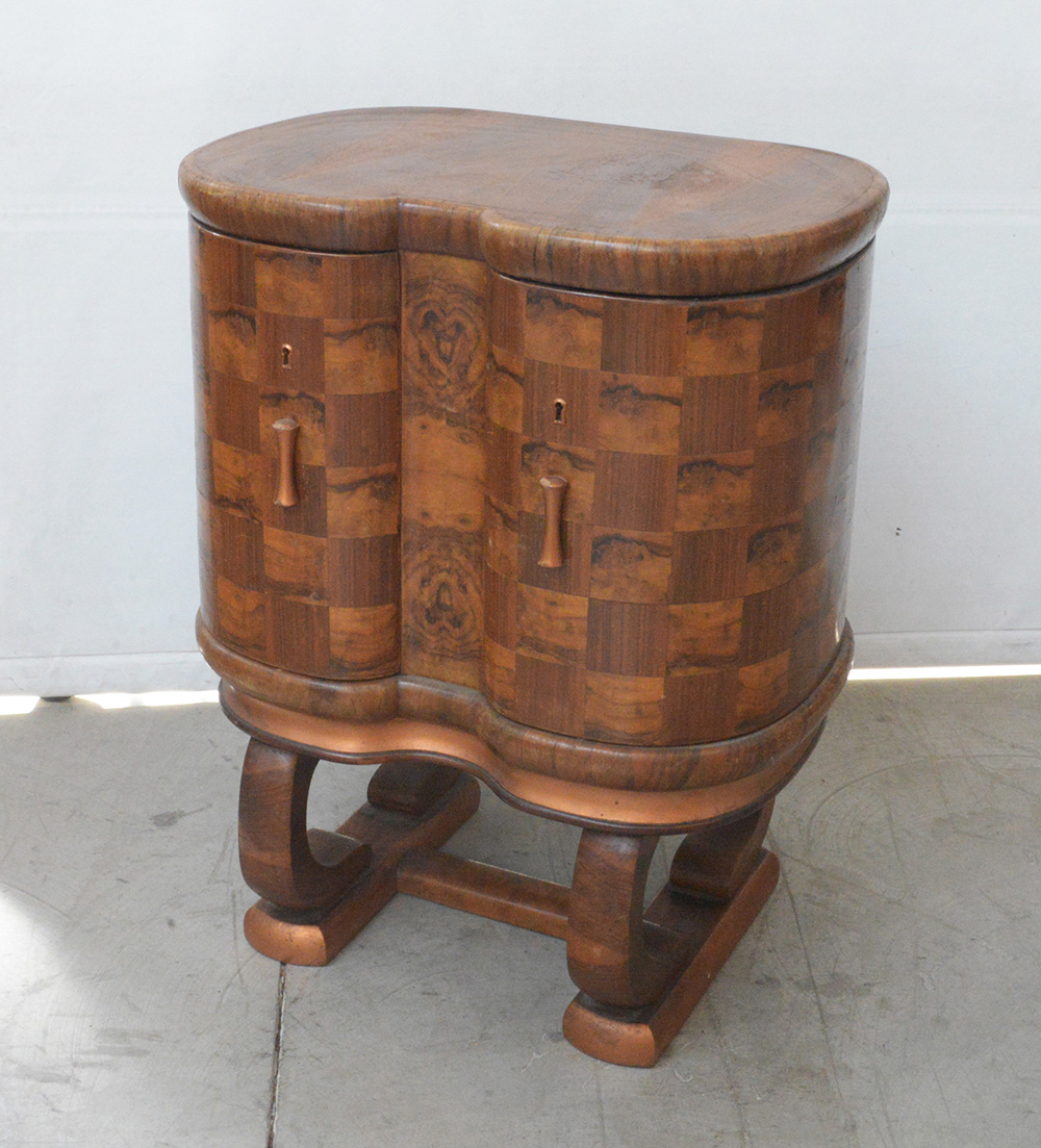 Mobiletto bar impiallacciato in legni diversi e radica dotato di due sportelli dallasuperficie curva. Interno rivestito specchio e illuminato. Italia, anni '30/'40. Recante sul retro etichetta metallica "Sarti". (cm 64x80x45) (difetti) -EN Mobiletto bar impiallacciato in legni diversi e radica dotato di due sportelli dallasuperficie curva. Interno rivestito specchio e illuminato. Italia, anni '30/'40. Recante sul retro etichetta metallica "Sarti". (cm 64x80x45) (difetti)