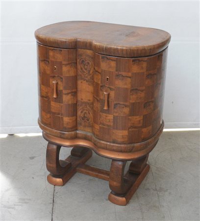 Mobiletto bar impiallacciato in legni diversi e radica dotato di due...