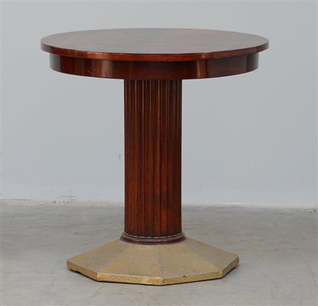 Tavolino tondo con base ottagonale rivestita in lastra di alluminio ottonato e baccellato, colonna centrale scanalata e piano filettato. Europa, anni '20. (h cm 70; d cm 69,5) -EN Tavolino tondo con base ottagonale rivestita in lastra di alluminio ottonato e baccellato, colonna centrale scanalata e piano filettato. Europa, anni '20. (h cm 70; d cm 69,5)