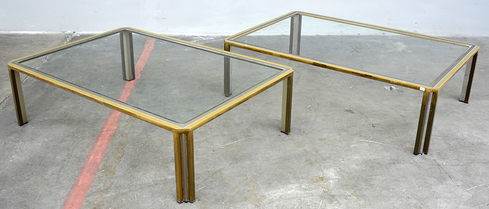 Coppia di tavolini da salotto con strutture in ottone e metallo cromato. Italia, anni '70. (cm 124x35x85) (lievi difetti) -EN Coppia di tavolini da salotto con strutture in ottone e metallo cromato. Italia, anni '70. (cm 124x35x85) (lievi difetti)