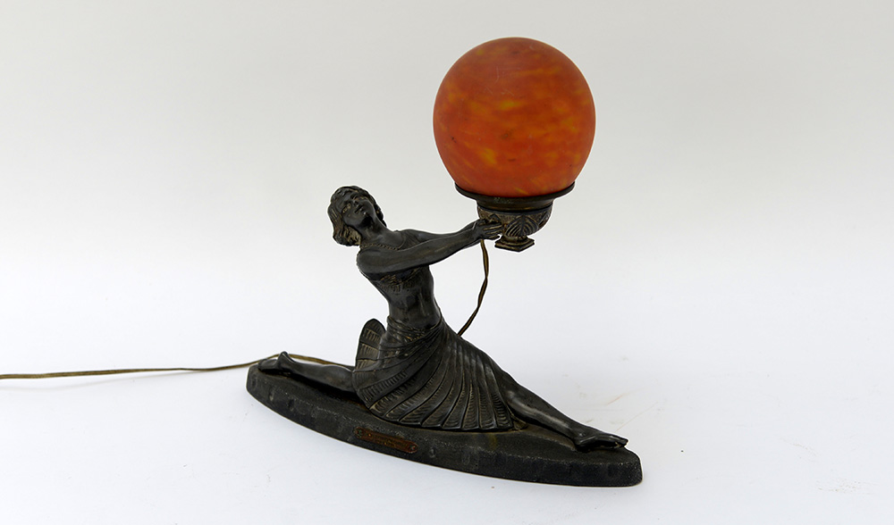 Lampada déco in fusione metallica in lega di stanio. Globo diffusore in vetro soffiato giallo arancio acidato sulla superficie esterna. Recante etichetta metallica dell'Esposizione Coloniale di Parigi del 1931. (difetti) -EN Lampada déco in fusione metallica in lega di stanio. Globo diffusore in vetro soffiato giallo arancio acidato sulla superficie esterna. Recante etichettametallica dell'Esposizione Coloniale di Parigi del 1931. (difetti)