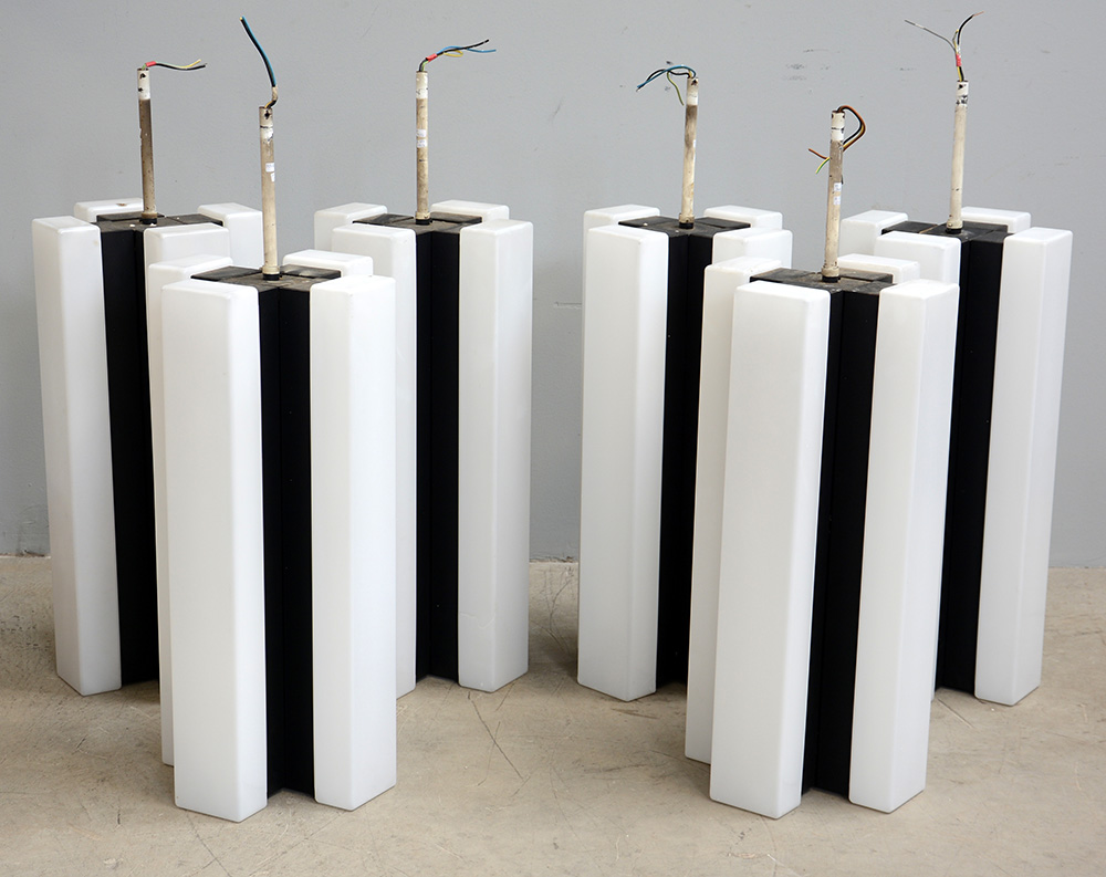 Lotto composto da sei lampade a sospensione a croce. Produzione Trilux, anni '70. Metallo laccato bianco e plexiglass. (cm 30x66x30) (difetti)
