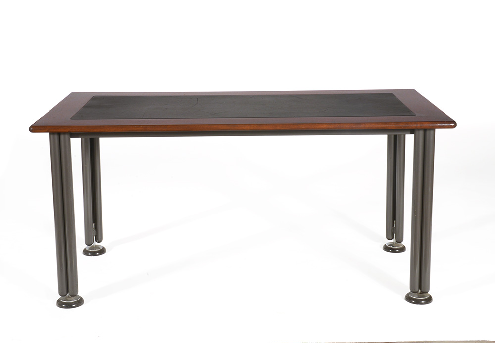 Luigi Caccia Dominioni (Milano 1913 - Milano 2016) Tavolo rettangolare modello "Tripletta". Produzione Azucena, Milano, anni '70. Piano in legno, inserto in pelle e quattro gambe in metallo. (cm 160x75x80) (difetti) -EN Rectangular table model "Tripletta". Produced by Azucena, Milan, 1970s. Wooden top, leather insert and four metal legs. (160x75x80 cm.) (defects)