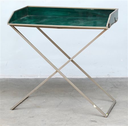 Romeo Rega (Attribuito) Tavolino con piano asportabile. Italia, anni '70. Struttura in metallo nichelato e in resina plastica verde marmorizzato. (cm 75,5x76x54) (difetti) -EN (Attribuito) Tavolino con piano asportabile. Italia, anni '70. Struttura in metallo nichelato e in resina plastica verde marmorizzato. (cm 75,5x76x54) (difetti)