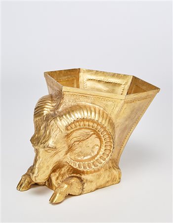 Gabriella Crespi (Milano 1922 - Milano 2017) Cachepot modello "Muflone". Milano, 1970. Rame sbalzato, cesellato a mano e argentato. Firmata a incussione sotto la base "Gabriella Crespi". (cm 25x16x19) Provenienza Showroom Gabriella Crespi, via Montenapoleone, Milano Collezione privata Esposizioni esemplare esposto alla mostra "Gabriella crespi Il segno e lo spirito", Palazzo Reale, Milano 24 settembre 2011-16 ottobre 2011 accompagnato da dichiarazione di autenticità dell'Archivio Gabriella Crespi, Milano -EN Chaiselled end embossed gilt-copper cachepot model "Muflone". Milan, 1970. Signed to base "Gabriella Crespi". (25x16x19 cm.) Provenance Showroom Gabriella Crespi, via Montenapoleone, Milano, Private Collection Exhibition sample exhibited at the show "Gabriella Crespi il segno e lo spirito" Palazzo Reale, Milano 24 September 2011-16 October 2011 Appended declaration of authenticity by Gabriella Crespi Archives Milano