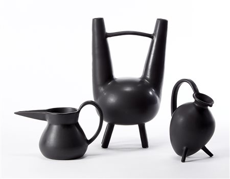 Tre vasi in ceramica smaltata in nero, realizzati su disegno di Gio Ponti. Esecuzione Pampaloni, Firenze, anni '90. Marcati sotto la base "Pampaloni - argentieri dal 1902" e con il monogramma della manifattura. (h cm 41; h cm 17; h cm 25) (lievi difetti) Provenienza Collezione Privata, Milano -EN Three black glazed ceramic vases based on a Gio Ponti design. Execution by Pampaloni, Florence, 1990s. Marked under the base "Pampaloni - silversmiths since 1902" and with the monogram of manufacture. (h cm 41; h cm 17; h cm 25) (slight defects) Provenance Private collection, Milano