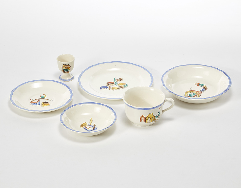 Gio Ponti (Milano 1891 - Milano 1979) (Attribuito) Servizio da bambino in terraglia smaltata in bianco, decorato in policromia e bordato in celeste, composto da un piatto piano, un piatto fondo, un piattino, una ciotolina una tazzina da te ed un porta uovo. Manifattura Richard-Ginori S. Cristoforo, Milano, anni '30. Marchio della manifattura in verde sotto la base. (Misure diverse) (lievi difetti) -EN (Attributed) Child service in white lacquered earthenware, decorated in polychrome and edged in light blue colour. Composed of a flat plate, a soup plate, a saucer, a small bowl a teacup and an egg holder. Manufacture of Richard-Ginori S. Cristoforo, Milan, 1930s. Manufacture's mark under the base. (different sizes) (slight defects)
