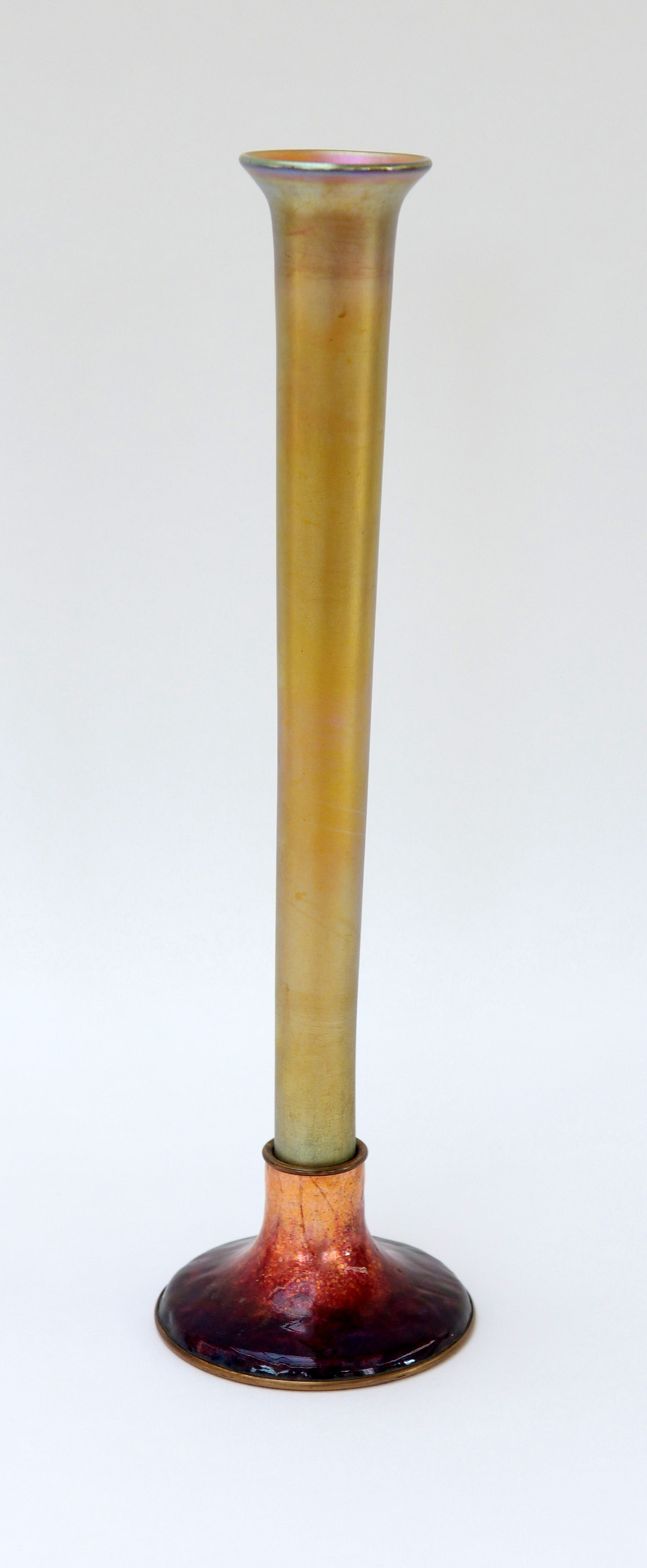 Tiffany Vaso cilindrico in vetro "Favrile" montato su base in ottone smaltato. New York, prima metà secolo XX. Marcato e numerato a incussione sotto la base "LOUIS C. TIFFANY FURNACES INC. 152" e con monogramma della manifattura. (h cm 42) -EN Vaso cilindrico in vetro "Favrile" montato su base in ottone smaltato. New York, prima metà secolo XX. Marcato e numerato a incussione sotto la base "LOUIS C. TIFFANY FURNACES INC. 152" e con monogramma della manifattura. (h cm 42)