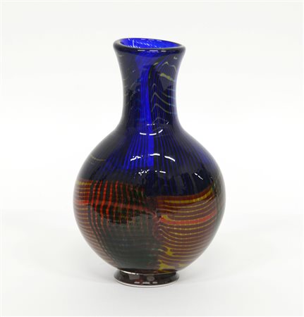 Manifattura di Murano. Vaso in vetro soffiato a fasce policrome sovrapposte nei toni del blu, del giallo e del rosso-arancio, base applicata in vetro incolore. Anni '90. (h cm 29) -EN Blown glass vase with polycrome bands overlapped in blue, yellow and orange-red shades. Colourless glass base applied. 1990s. (h 29 cm.)