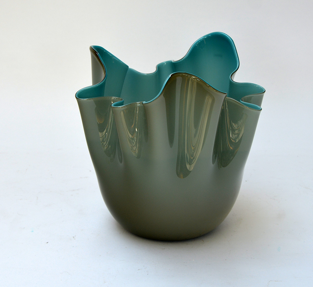 Venini "Fazzoletto" Vaso in vetro incappucciato grigio e azzurro. Murano, 2013. Firmato e datato a punta sotto la base. In scatola originale. -EN "Fazzoletto" Vaso in vetro incappucciato grigio e azzurro. Murano, 2013. Firmato e datato a punta sotto la base. In scatola originale.