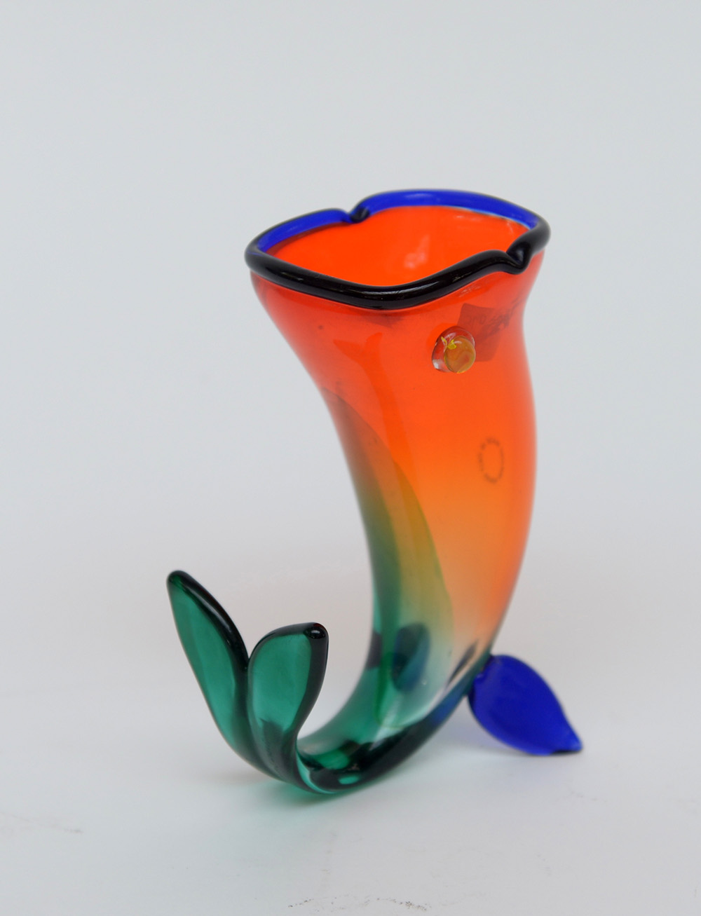 Fulvio Bianconi (Padova 1915 - Milano 1996) Pesce in vetro soffiato, arancio, verde e incolore trasparente con pinne e orlo della bocca in vetro blu, occhi applicati gialli e incolore. Venini, Murano, 1993. Firmato e datato a punta sotto la base. -EN Pesce in vetro soffiato, arancio, verde e incolore trasparente con pinne e orlo della bocca in vetro blu, occhi applicati gialli e incolore. Venini, Murano, 1993. Firmato e datato a punta sotto la base.