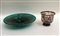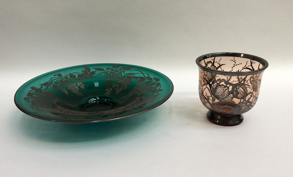 Lotto composto da un centrotavola in vetro verde e un vaso in vetro ambrato con applicazioni in lamina d'argento a decoro floreale. Italia, inizio secolo XX. (difetti) -EN Lotto composto da un centrotavola in vetro verde e un vaso in vetro ambrato con applicazioni in lamina d'argento a decoro floreale. Italia, inizio secolo XX. (difetti)