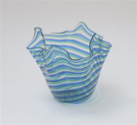 Manifattura di Murano Piccolo vaso a fazzoletto in vetro soffiato a canne ritorte incolore blu e verde. Seconda metà secolo XX. (h cm 13,5) -EN Manifattura di Murano Piccolo vaso a fazzoletto in vetro soffiato a canne ritorte incolore blu e verde. Seconda metà secolo XX. (h cm 13,5)