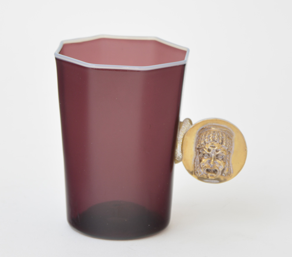Manifattura di Murano Bicchiere in vetro soffiato ametista a sezione ottagonale con orlo applicato in vetro lattimo e pastiglia con maschera dorata applicata a caldo. Prima metà secolo XX. -EN Manifattura di Murano Bicchiere in vetro soffiato ametista a sezione ottagonale con orlo applicato in vetro lattimo e pastiglia con maschera dorata applicata a caldo. Prima metà secolo XX.