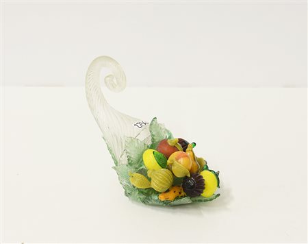 Manifattura di Murano. Cornucopia con frutti policromi. Esecuzione recente. (h cm 20,5) (lievi difetti) -EN Manifattura di Murano. Cornucopia con frutti policromi. Esecuzione recente. (h cm 20,5) (lievi difetti)
