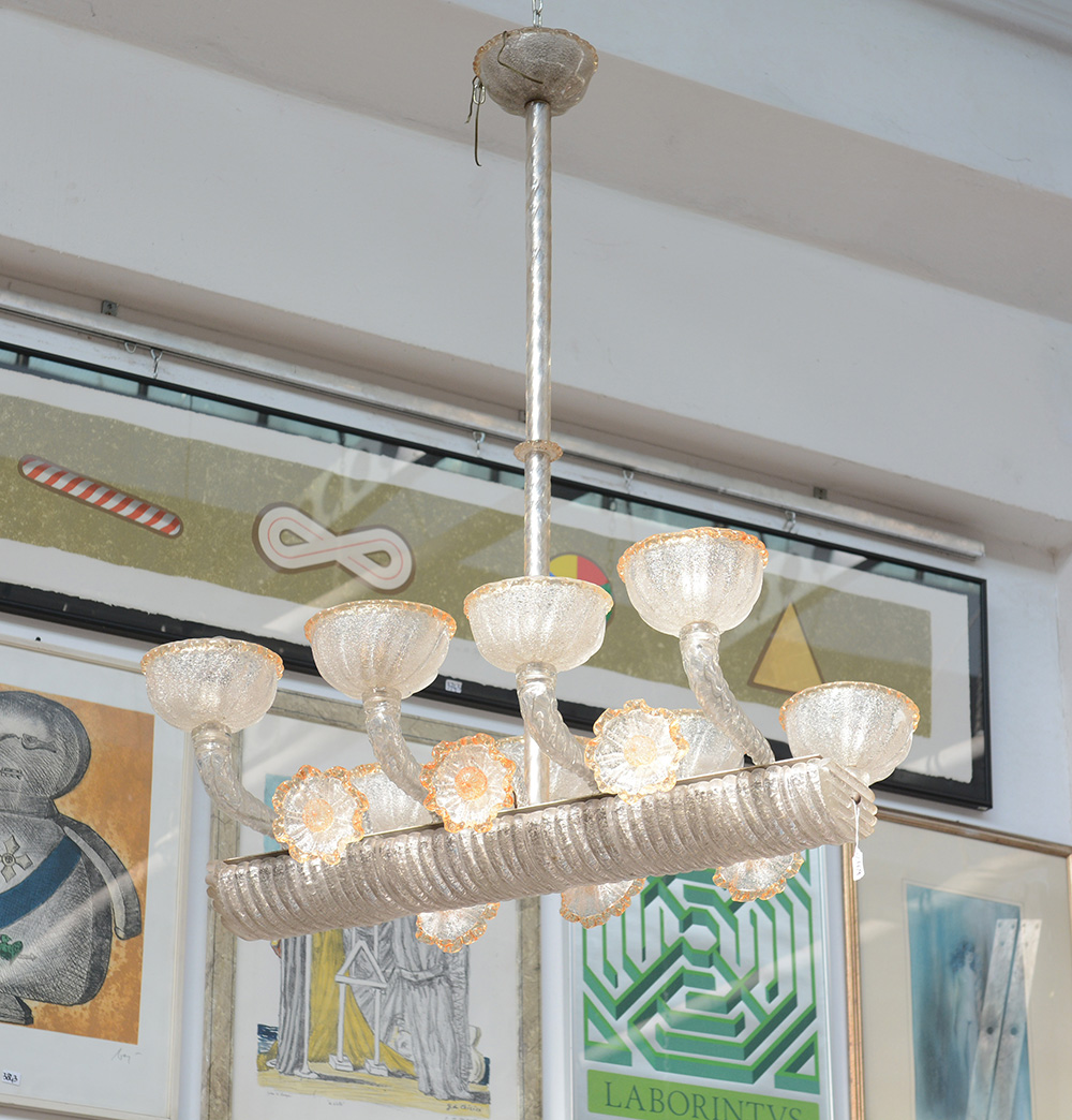 Barovier & Toso Lampada a sospensione in vetro soffiato ""rugiada"" incolore e pagliesco a otto luci e decorato con sei fiori. Murano, anni '40. (lievi difetti)