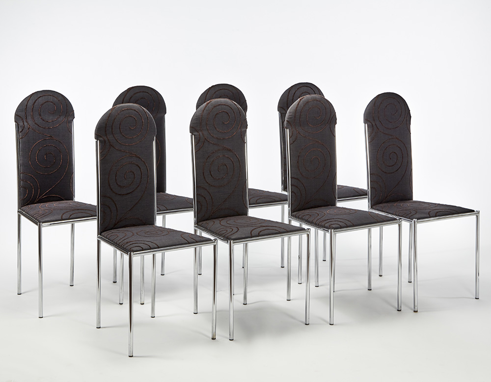 Otto sedie in tubolare metallico cromato con sedile e schienale imbottiti e rivestiti in tessuto grigio con decorazioni in velluto marrone a volute. Italia, produzione recente. -EN Otto sedie in tubolare metallico cromato con sedile e schienale imbottiti e rivestiti in tessuto grigio con decorazioni in velluto marrone a volute. Italia, produzione recente.