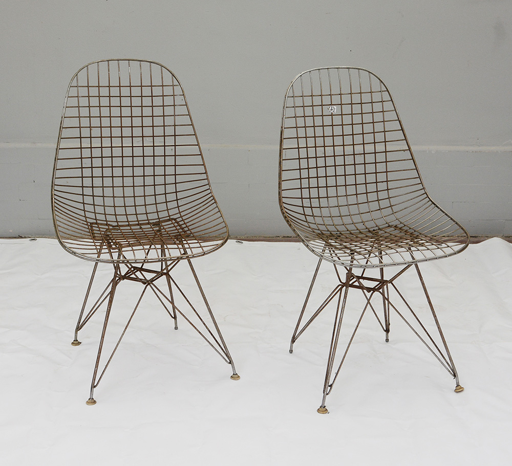 Charles (1907 - 1978) e Ray Eames (1912 - 1988) Coppia di sedie modello "Wire DKR". Produzione Hermann Miller, USA, anni '50. Tondino di ferro cromato. (difetti e mancanze) -EN Coppia di sedie modello "Wire DKR". Produzione Hermann Miller, USA, anni '50. Tondino di ferro cromato. (difetti e mancanze)