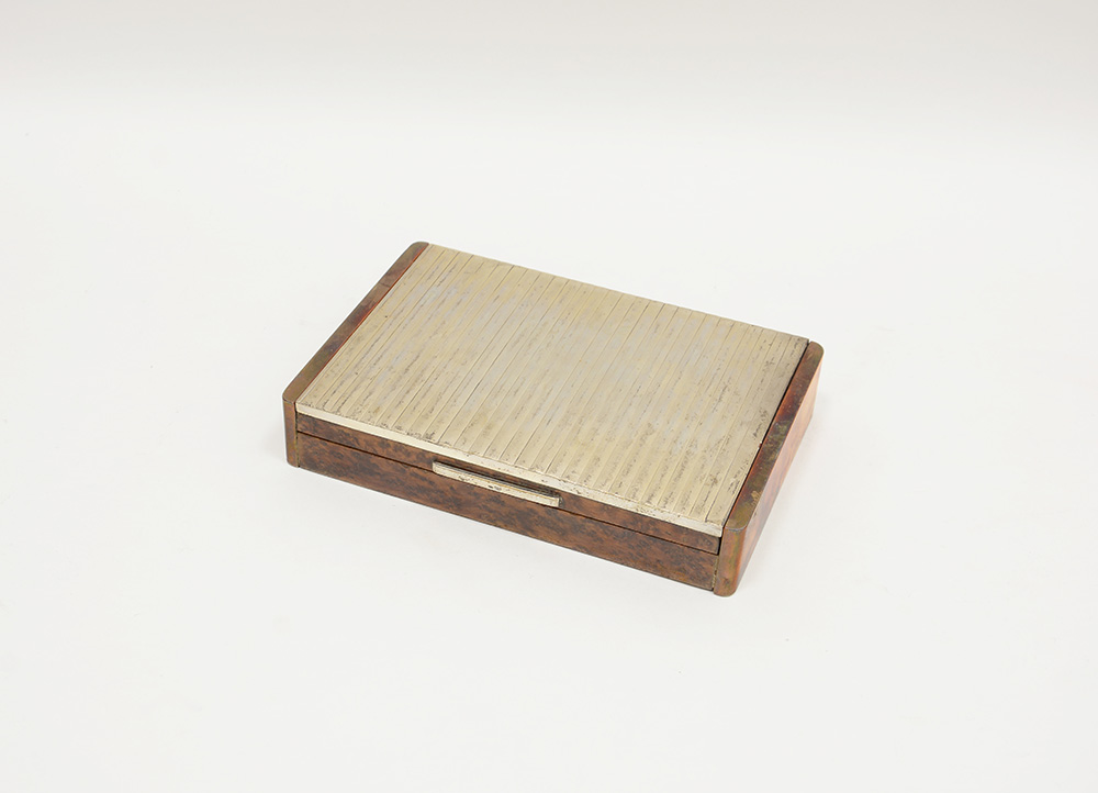 Portasigarette da tavolo in legno con lastronatura in radica, montanti in rame e coperchio rivestito in argento titolato 800. (cm 19,5x13) (lievi difetti) -EN Portasigarette da tavolo in legno con lastronatura in radica, montanti in rame e coperchio rivestito in argento titolato 800. (cm 19,5x13) (lievi difetti)
