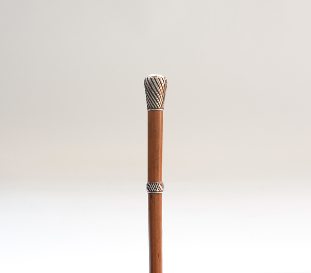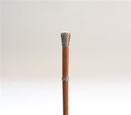 Bastone animato con canna di malacca e pomolo in argento sbalzato e cesellato...