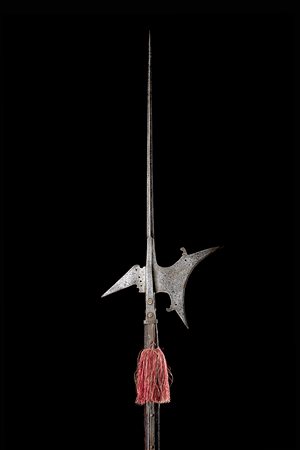 Alabarda a rostro con lungo spuntone a quadrello, fissata all'asta da quattro bandelle. Lombardia, ultimo quarto secolo XVI (l. cm 77) (difetti) -EN A halberd, Northern Italy, late 16th century (l cm 77)(defects)