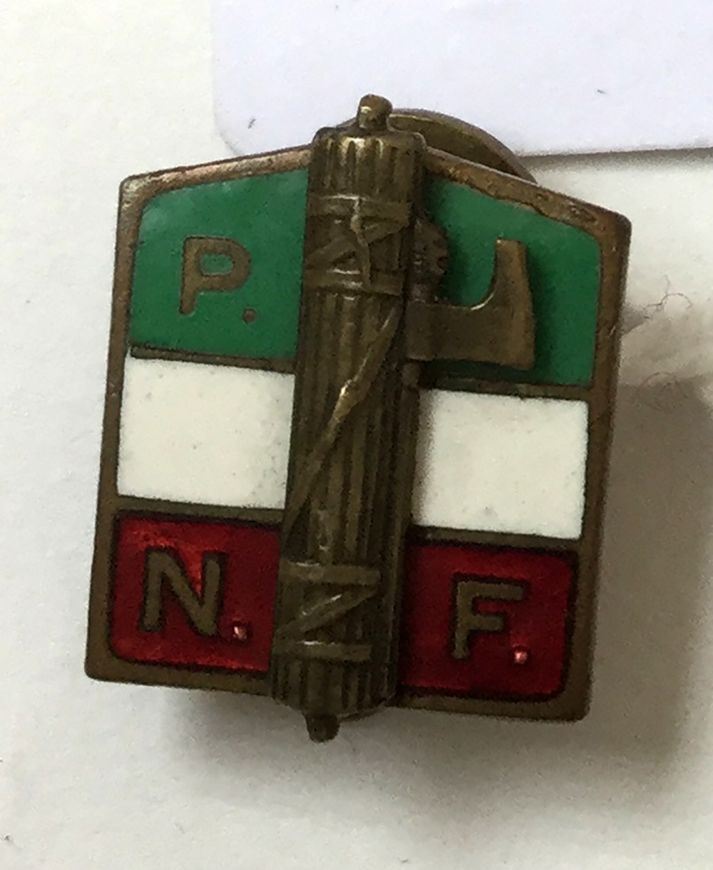 Originale cimice in ottone e smalti del Pnf. Produzione di Lorioli, Milano. Anni '20 (difetti)