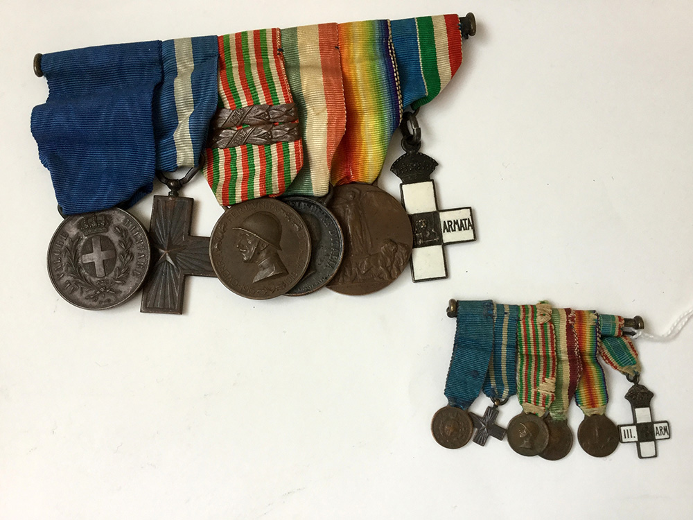 Sbarretta di medaglie valor militare bronzo (Zecca) composta da una croce in bronzo (merito di guerra), una medaglia di bronzo 1915-1918 per l'Unità con barra datata 1917-1918, una medaglia in bronzo per Unità d'Italia 1848-1918 ed un'interessante croce smaltata della terza armata. Acclusa barretta mignon con medesime medaglie. Prima metà secolo XX (difetti)