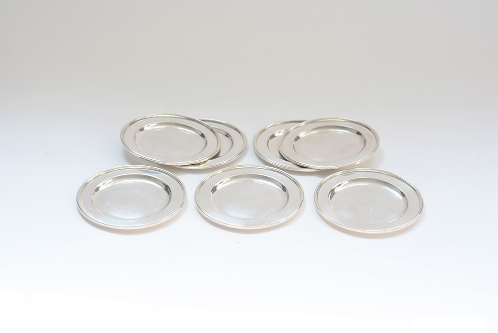 Lotto di sette piattini per il pane in argento (d cm 14). Argentiere Spoggi (gr 970)