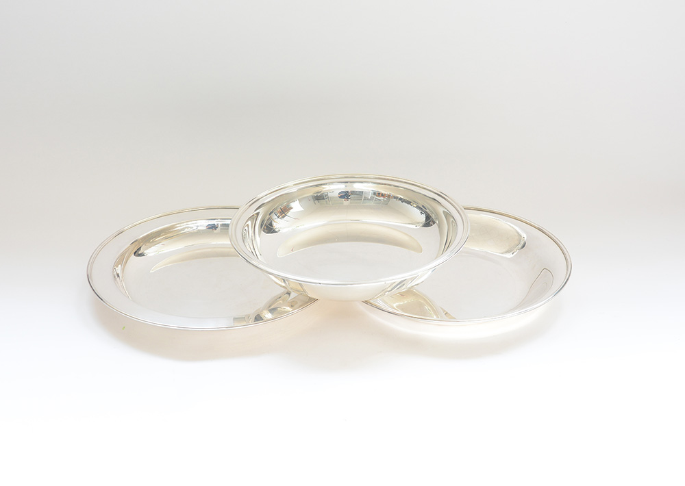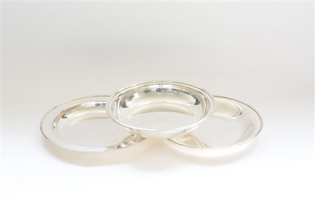Lotto di tre piatti da portata in argento a bordo liscio (d max cm 33) (gr 2600)
