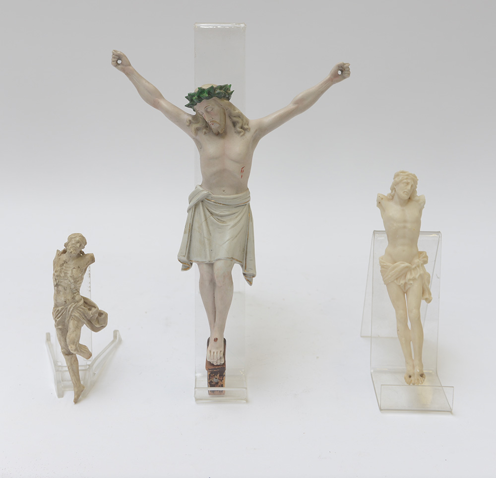 Lotto composto da tre sculture in porcellana e materiali diversi raffiguranti Cristo (difetti)