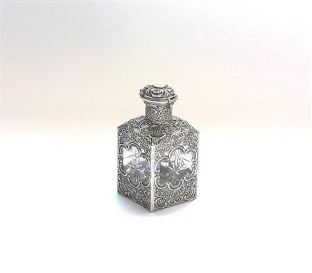 Piccola bottiglia porta liquore in cristallo rivestito in argento sbalzato e traforato