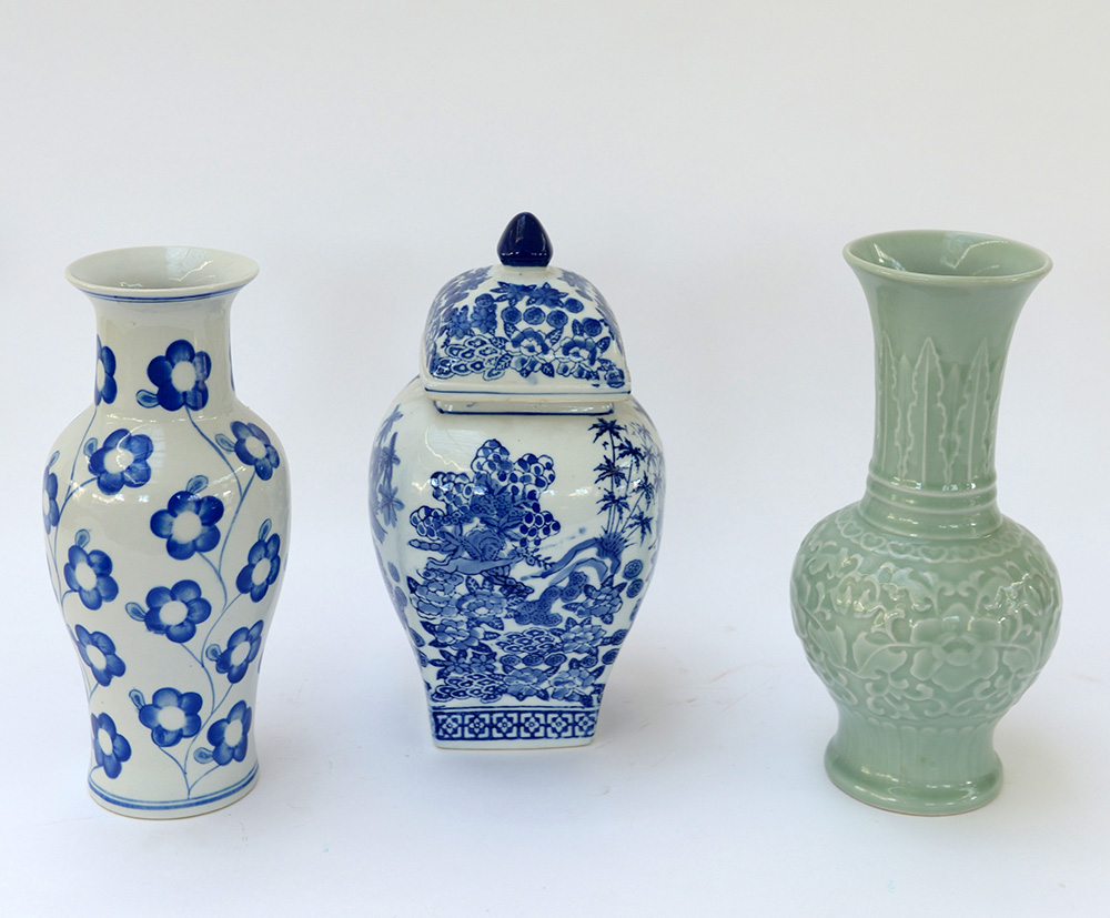 Lotto composto da un vaso e una potiches con decori blu e un vaso a decoro Celadon (lievi difetti)