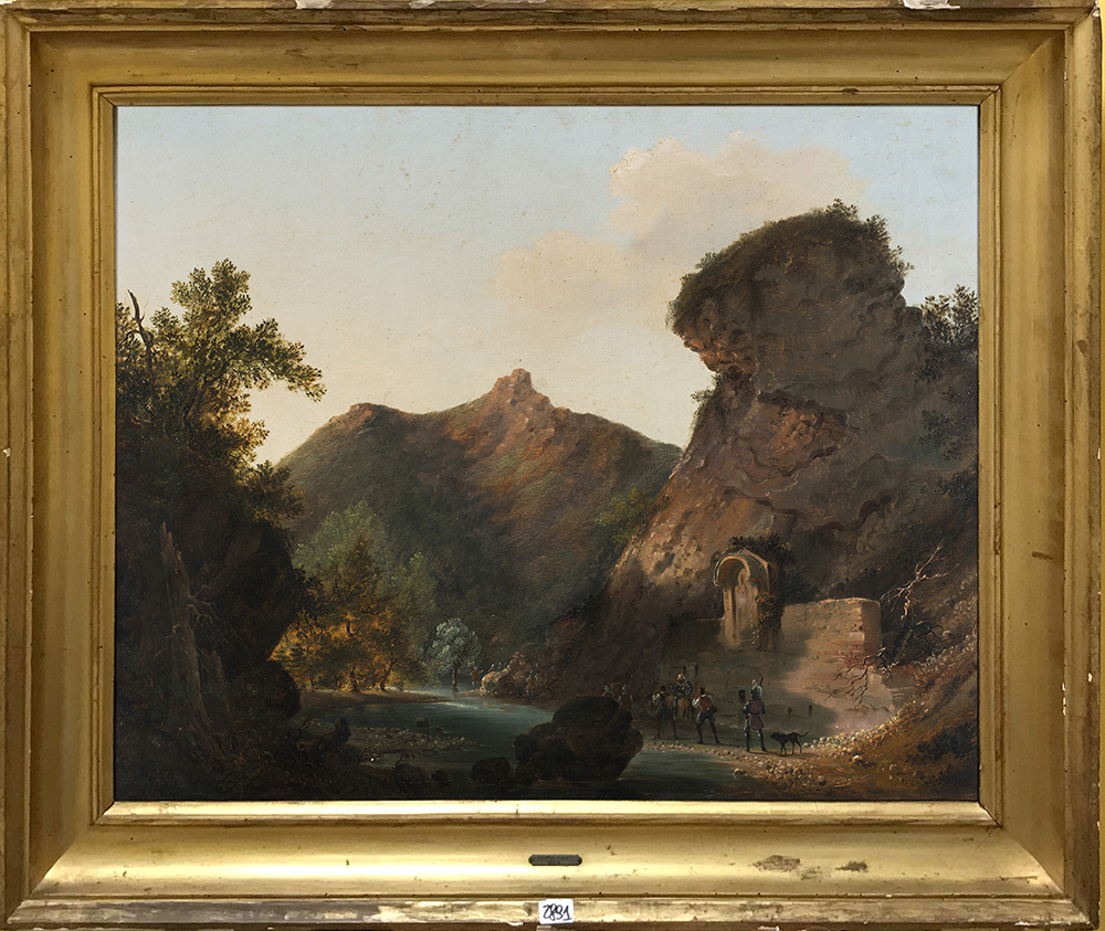 Pompeo Calvi (Milano 1806 - 1884) "Veduta con cavalieri" 1836 olio su tela (cm 60x74.5) Firmato e datato in basso a sinistra (difetti) In cornice