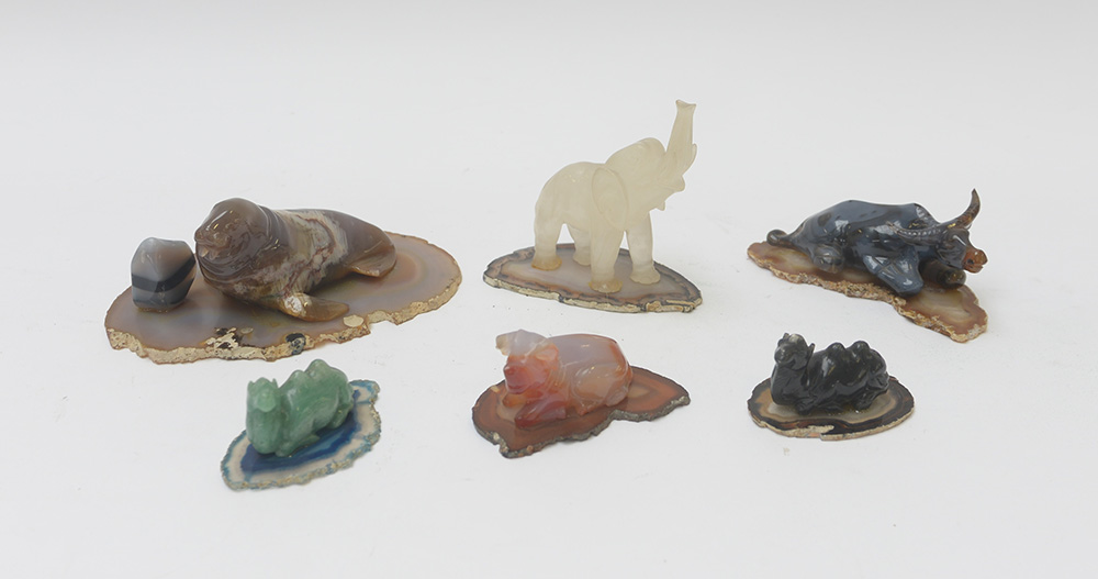 Lotto composto da sei animali in pietre dure poggianti su base in agata (difetti)