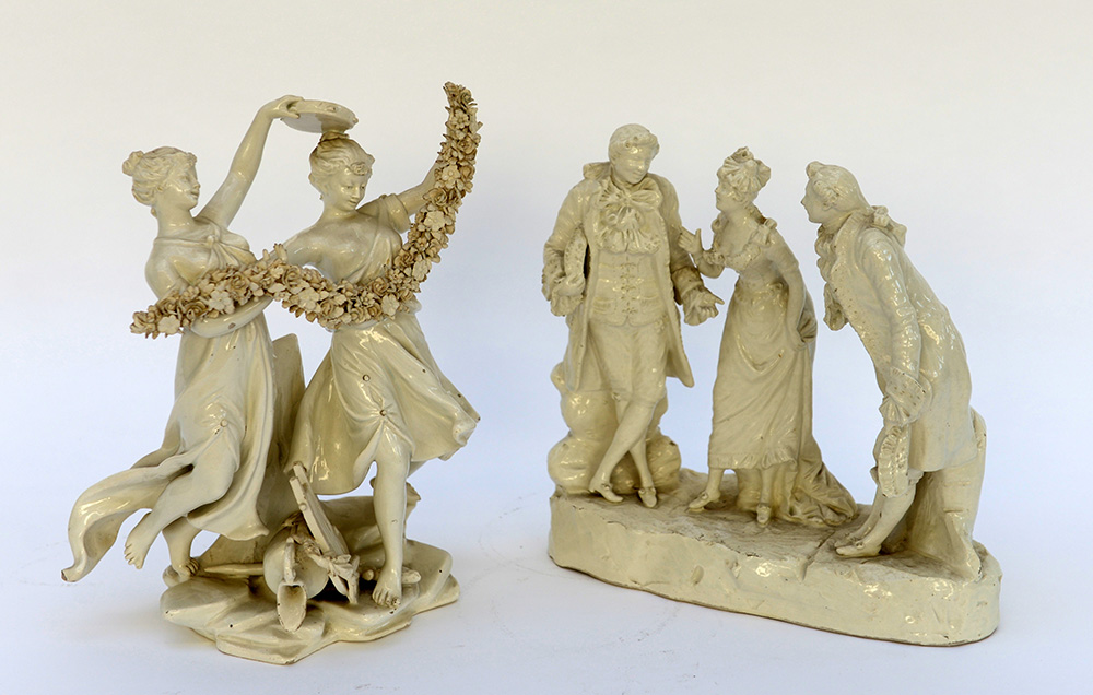 Manifatture diverse. Due gruppi in terraglia smaltata bianca raffiguranti vestali e scena galante (difetti)