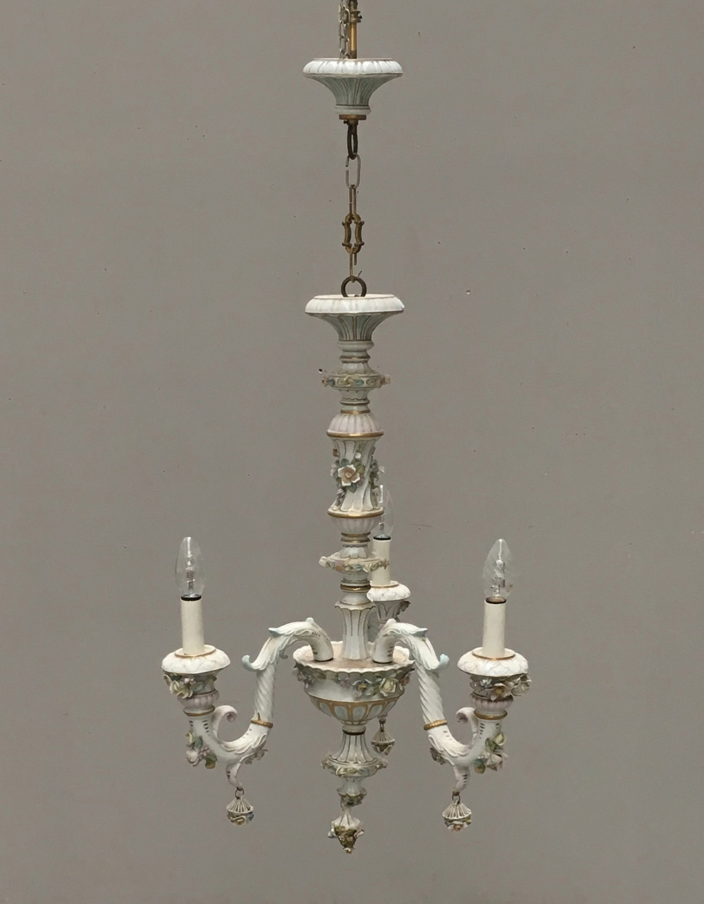 Lampadarietto in porcellana a tre bracci con fiori a rilievo applicati e...
