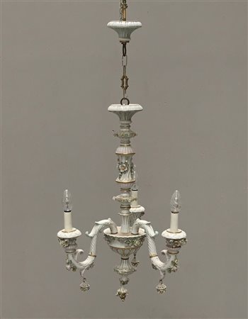 Lampadarietto in porcellana a tre bracci con fiori a rilievo applicati e contorni dorati (h cm 67) (difetti)