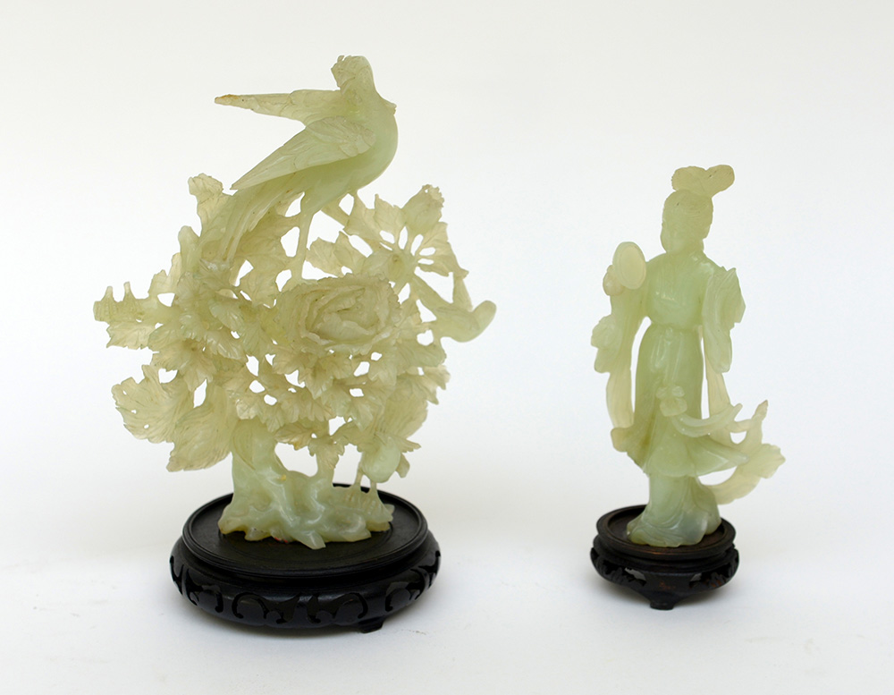 Manifattura cinese. Lotto composto da due gruppi in giadeite raffiguranti geisha e volatili su rami (difetti)