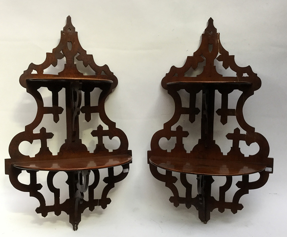 Coppia di piccole mensole a due ripiani con struttura in legno traforato (cm 35x56x17) (difetti e restauri)