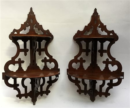 Coppia di piccole mensole a due ripiani con struttura in legno traforato (cm...