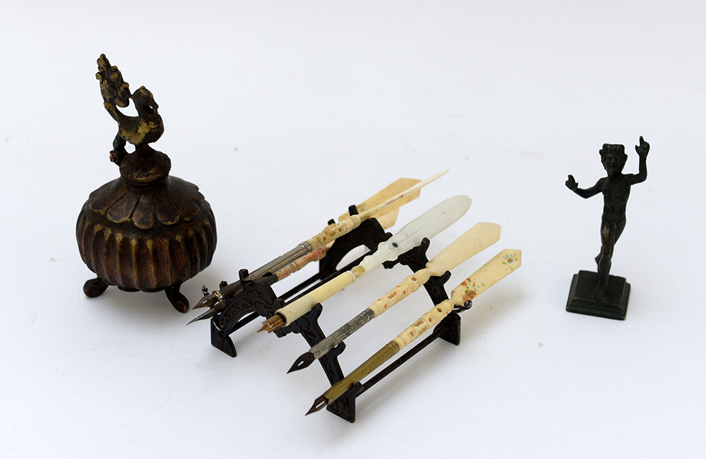 Lotto composto da un calamaio, una sculturina e un portapenne con pennini in materiali diversi (difetti)