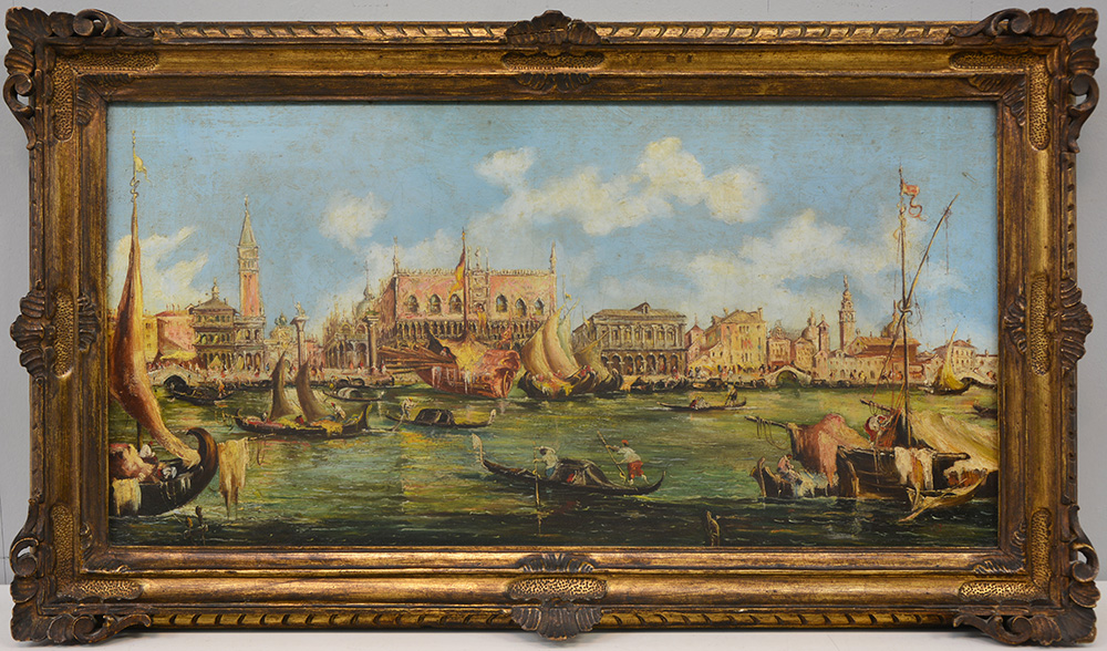 Ignoto secolo XX "Scorcio veneziano" olio su tela (cm 36x71) Siglato in basso a destra. In cornice