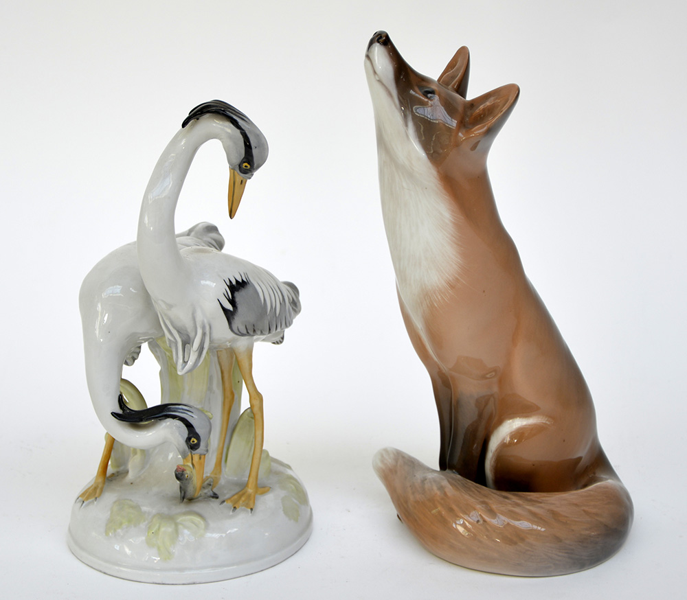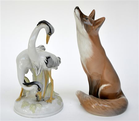 Manifatture diverse. Due gruppi in ceramica raffiguranti volpe e aironi...