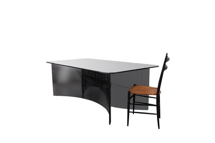 Grande tavolo da pranzo con basamento formato da due lastre curvate e piano in cristallo di forte spessore grigio fumé.