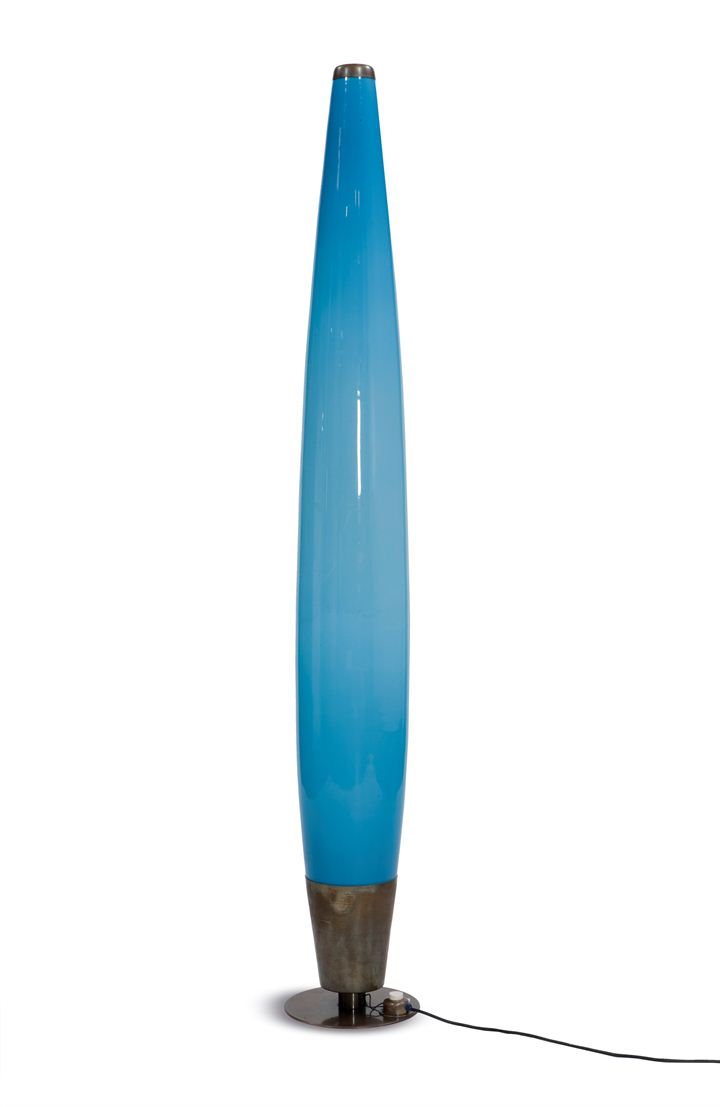 Lampada da terra con diffusore in vetro opalino azzurro di eccezionali dimensioni.