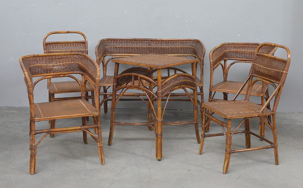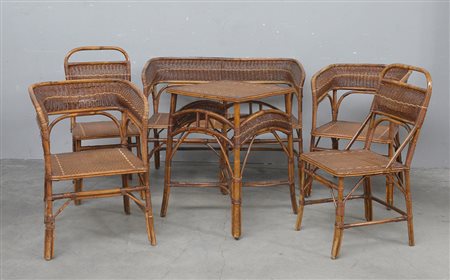 Fornitura da veranda con struttura in bambù e rattan composta da un divano a due posti, due poltroncine, due sedie e un tavolino (difetti)