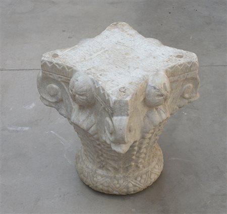Antico capitello in marmo decorato a foglie e volute (difetti)